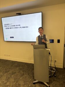 はじめに賢誠総合法律事務所の高橋先生から「失敗事例から学ぶ日本の遺言書の書き方」として、日本側の法務面から日本の遺言制度の基礎知識にはじまり、失敗事例を紹介、その教訓と対策について分かりやすく説明をいただきました。