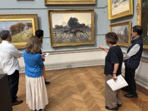今回は、同美術館で長年ご活動されている日本人ボランティアの方のご案内のもと、南本館に展示されている作品について解説いただきました。南本館では、植民地時代の作品などオーストラリアの歴史を物語る作品が並ぶ一方で、先住民にルーツをもつ作品も併せて展示されており、多様な視点からオーストラリアの歴史と文化を読み解くことができる構成となっています。当日は日本人会会員の方を中心に12名の方が参加いただき、日本人ボランティアの松田さんと森岡さんの案内で、2グループに分かれてツアーを行いました。
