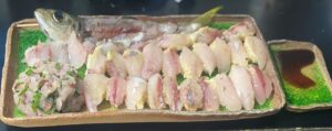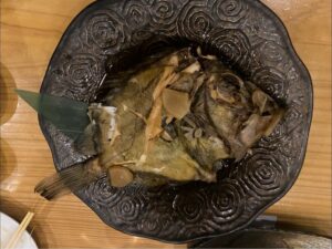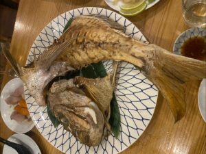 彩さんが釣られた69cm大鯛の姿造とそのあらの塩焼きの他的鯛、ピッグフィシュ他釣れたての魚に可児大悟シェフが腕を奮われた魚尽の料理を堪能。大鯛のあらの塩焼きを頼んだところマグロの頭の塩焼きまでおまけでいただく大サービス。