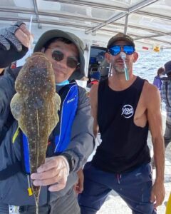 写真右:三浦さんマゴチとひょうきんなAdam船長