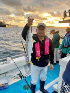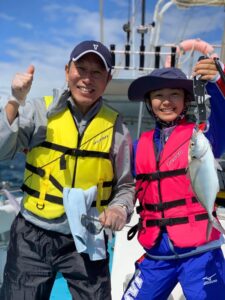 岸近くですが一か所ある窪みで魚が群れる場所にアンカリングしたのでヒラマサが群れてリリースサイズではありますが初参加の八尋愛さんを含む多くの方が何匹もヒラマサが釣れ青物特有の強い引きを堪能しました。