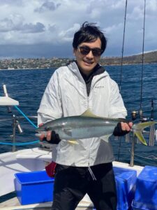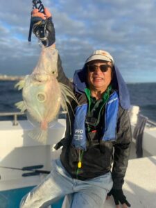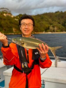その後場所を移動、持ち帰る獲物は下前原さんがオーストラリアサーモン、白井さんがテーラー、上野さんがカワハギ3匹、縞鯵、今回が最後の参加となるお嬢様の美惺さんも縞鯵、宮地さんヒラメなど。