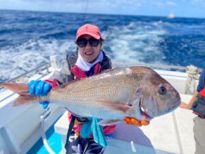 Tony船長のFishfinder で水深60m超のちょっと南下した場所で彩さんが69cmの大真鯛を釣られました。当方釣部部長になってからの釣会で釣れた最大の真鯛で堀江先生によれば過去最大は70cm超が1回あったきりとの事でこの20-30年で2番目の大真鯛ではと思います。