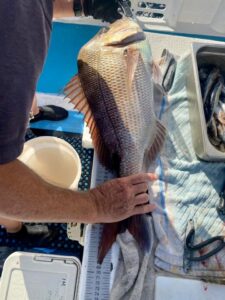 当方森さんが釣られた小さい鯖を生き餌に高級魚的鯛(ジョンドーリ)も釣れました。ピッグフィッシュ、マーウォン、金目鯛、マゴチなども釣れましたが真鯛のKeep SizeはFishfinderでは彩さんの大真鯛のみ。